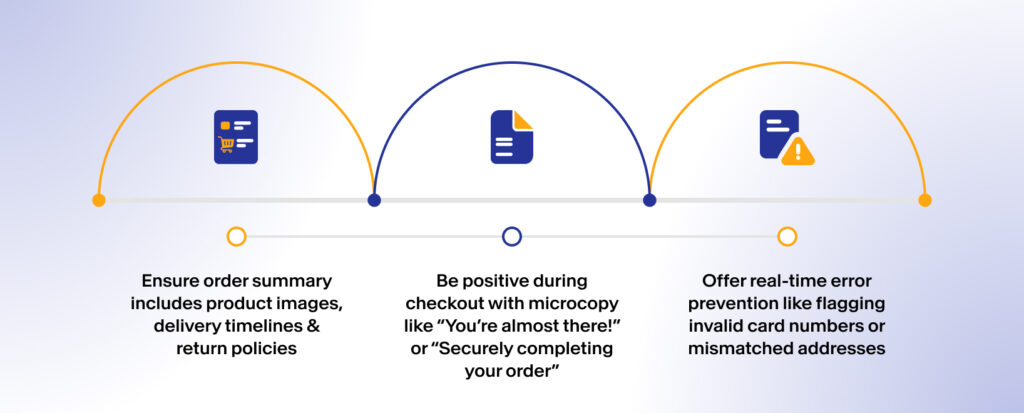 - Be positive during checkout with microcopy like “You’re almost there!” or “Securely completing your order”