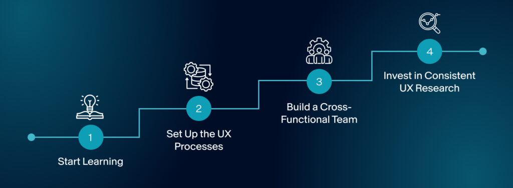 A few UX professionals or a small UX team begin introducing structured activities like basic usability tests when building prototypes or persona creation before they start designing. However, these efforts are project-based and hence, make them less impactful.